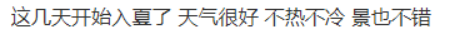 “这几天开始入夏了 天气很好 不热不冷 景也不错”