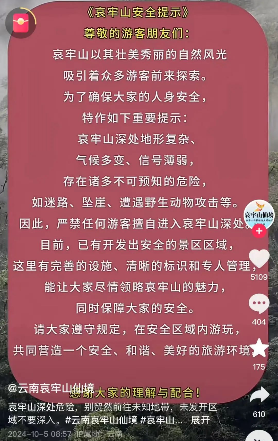 10月5日,@云南哀牢山仙境 发布安全提示:未开发区域不要深入!