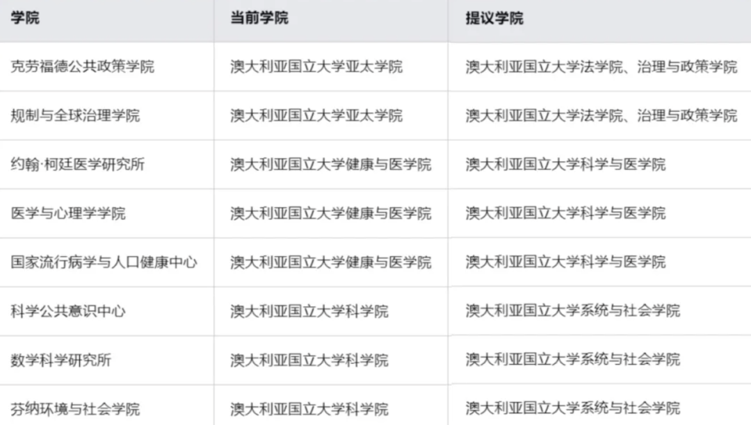 3. 法学院重组并更名:ANU College of Law将更名为ANU College of Law, Governance and Policy(法学院、治理与政策学院)。重组后的学院将包括法学院、克劳福德公共政策学院、规制与全球治理学院及国家流行病学与人口健康中心。