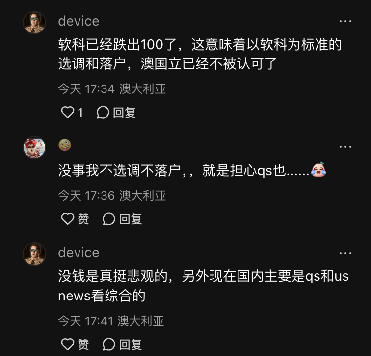 然而,网友们对于ANU的前景普遍持悲观态度。有人评论道:“软科已经跌出100了,这意味着以软科为标准的选调和落户,澳国立已经不被认可了。”而这对于以往将ANU作为升学和移民重要考虑的国际学生来说,无疑是一个巨大的打击。