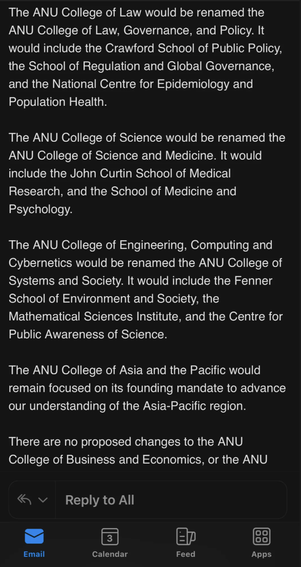 2. 理学院更名:原ANU College of Science将更名为ANU College of Science and Medicine,以反映其新增的医学相关学科。这一决定也引发了学生和教师对学术机构整合后,原有专业特色可能被稀释的担忧。