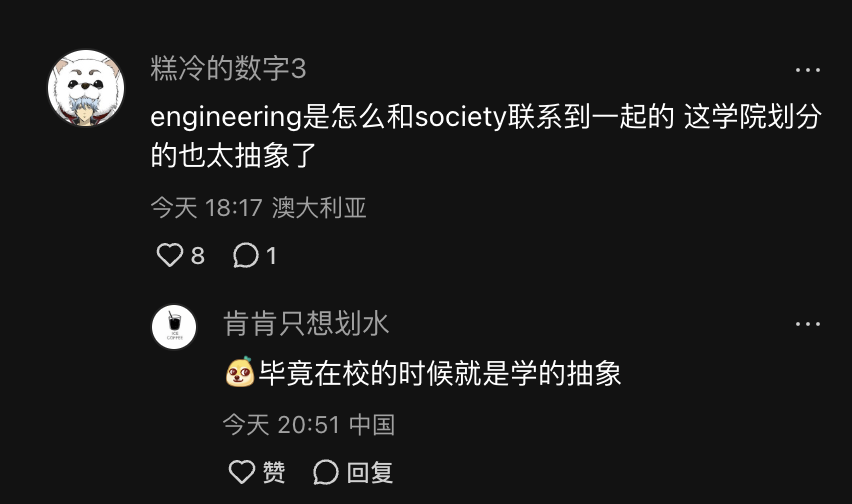 此外,对于工程学院更名为“系统与社会学院”这一举措,网友“糯冷的数字3”质疑道:“engineering是怎么和society联系到一起的,这学院划分的也太抽象了。”这一评论反映出部分学生和校友对学院重组后学术方向和重点可能变得模糊不清的忧虑。