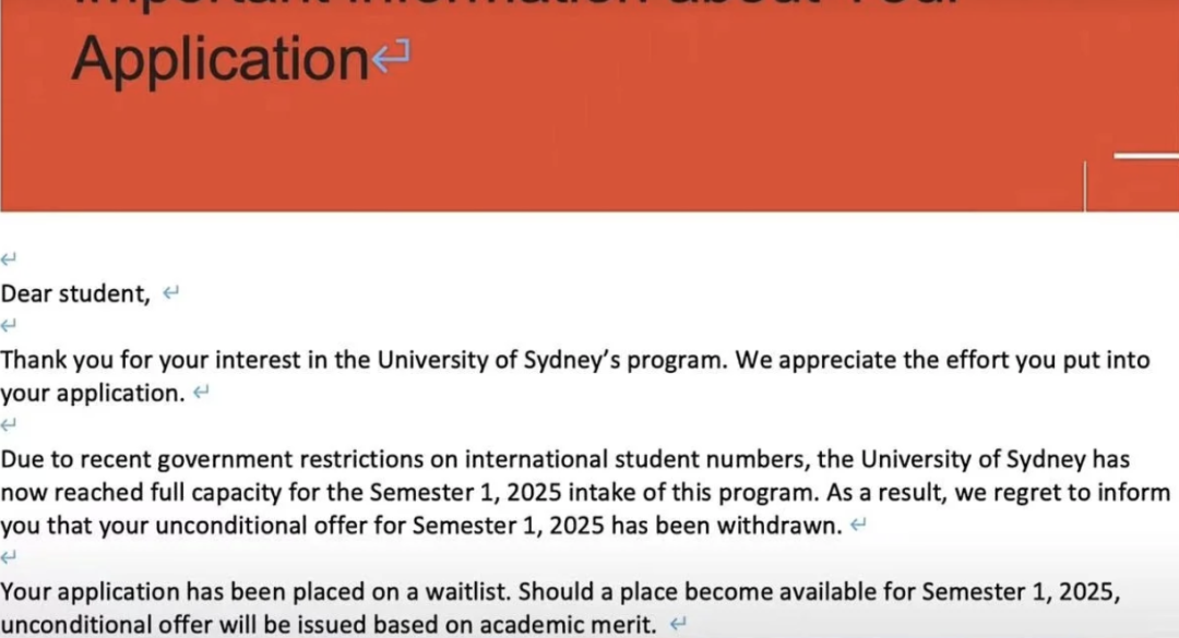 近日,悉尼大学向部分已经获得无条件录取通知书的国际学生发送了令人意外的邮件——他们的录取通知被撤回,并被列入候补名单。