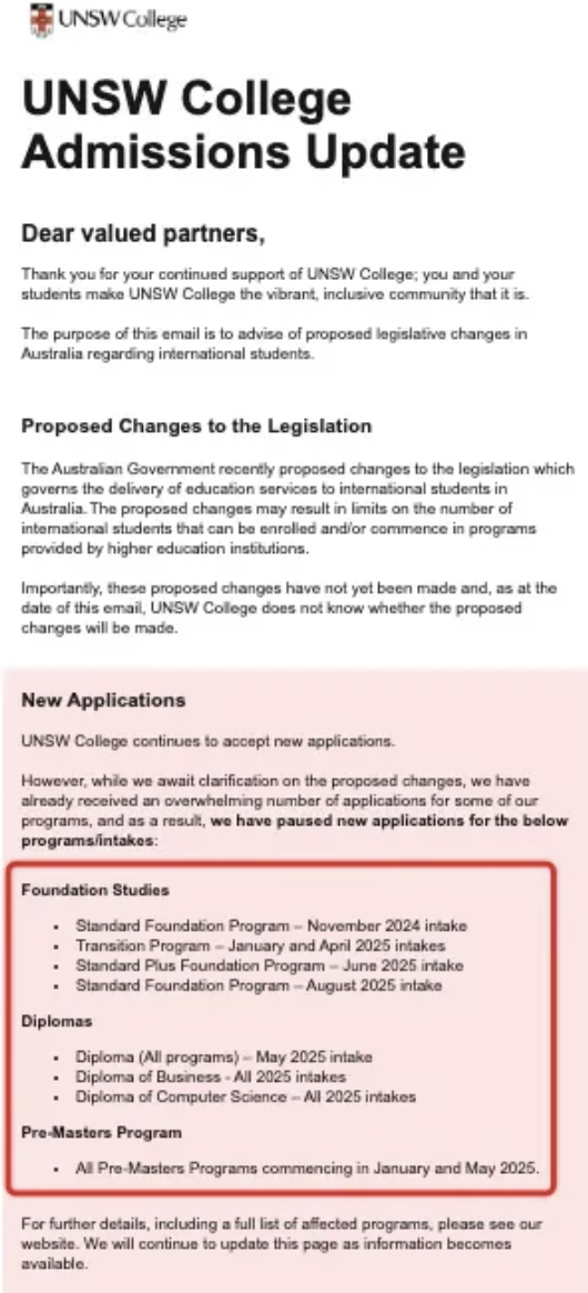 其官方文件表示:2025年UNSW的所有针对留学生的申请将在2024年10月16日星期三下午4点(澳大利亚东部夏令时间)停止。