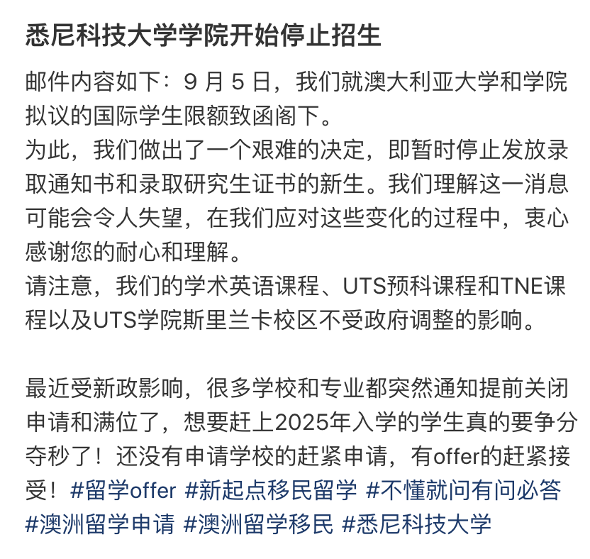 近日,悉尼科技大学学院(UTS College)发布了一则令人关注的消息,宣布暂时停止发放新生录取通知书和录取研究生证书。