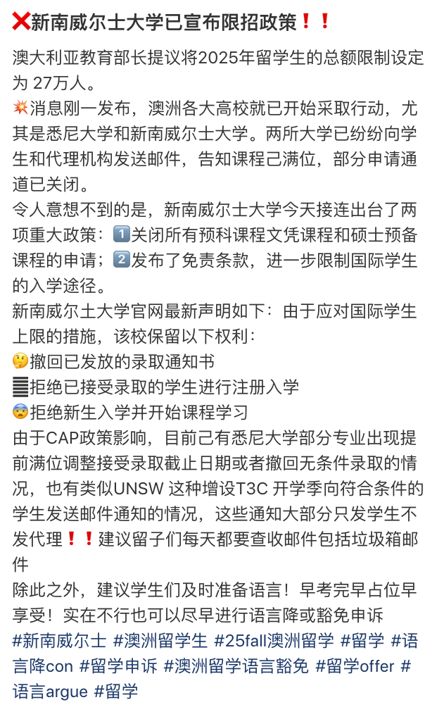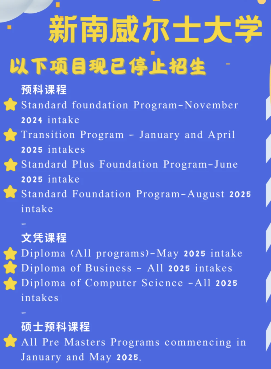 24小时内,澳洲QS排名世界第19的新南威尔士大学(UNSW)宣布:即将关闭2025年所有三个入学季的申请,这一决定并非针对明年的第一个学期,