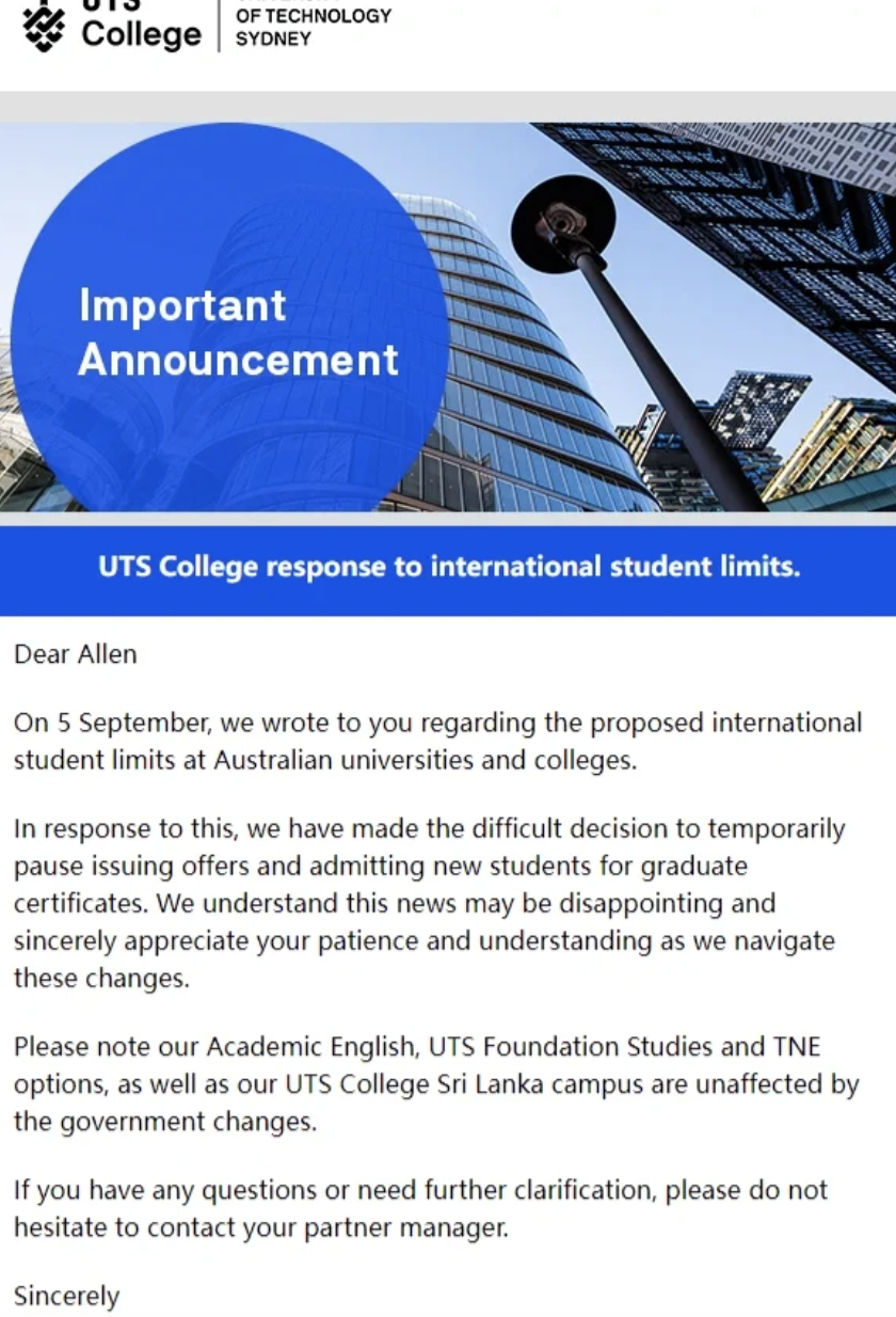 9月5日,悉尼科技大学学院曾就澳大利亚大学和学院拟议的国际学生限额问题向相关人士发送了邮件。