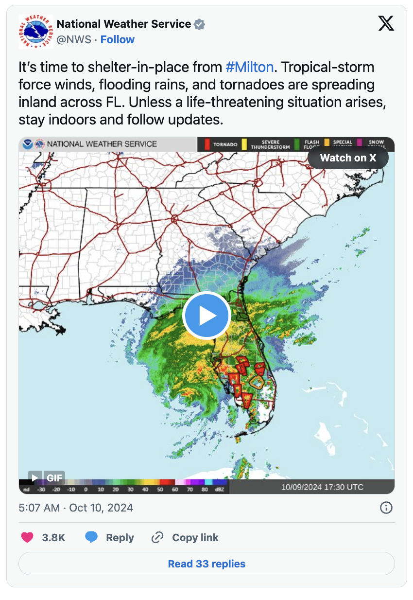 伴随Milton飓风而来的不仅是强风暴雨,数十个龙卷风也在风暴外围频繁出现。
