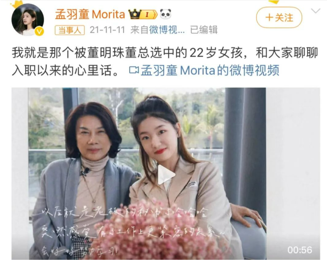 2021年,年仅22岁的孟羽童参加一档职场综艺,被董明珠选中,成为她的秘书,从此走红。