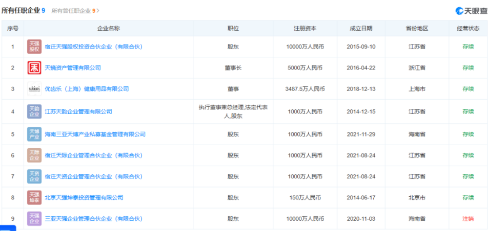 同时,据天眼查APP显示,章泽天关联了9家公司,多担任股东、董事长等职务,其中3家与刘强东存在商业关联。