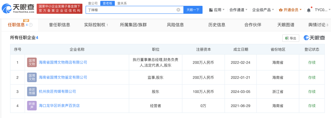 天眼查官网显示,丁祥栩目前名下共关联了4家企业,均为存续状态,包括海南省国博文物商店有限公司、杭州良匠传媒有限公司、海南省国博文物鉴定有限公司、海口龙华区听泉声百货店,丁祥栩在上述企业担任股东、法定代表人、执行董事等职务。