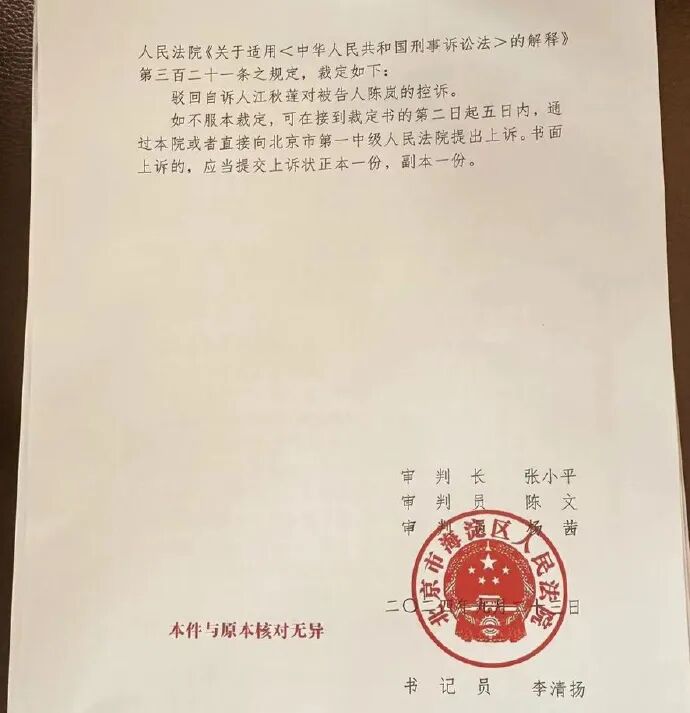 而就在前段时间,就江歌妈妈江秋莲刑事自诉作家陈岚犯诽谤罪一案,北京市海淀区人民法院驳回了江秋莲的控诉。