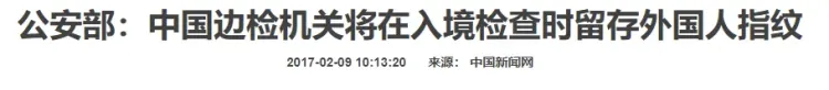 早在2017年2月10日, 中国公安部发布新政策规定:对入境中国的14(含)至70(含)周岁外国人留存指纹。