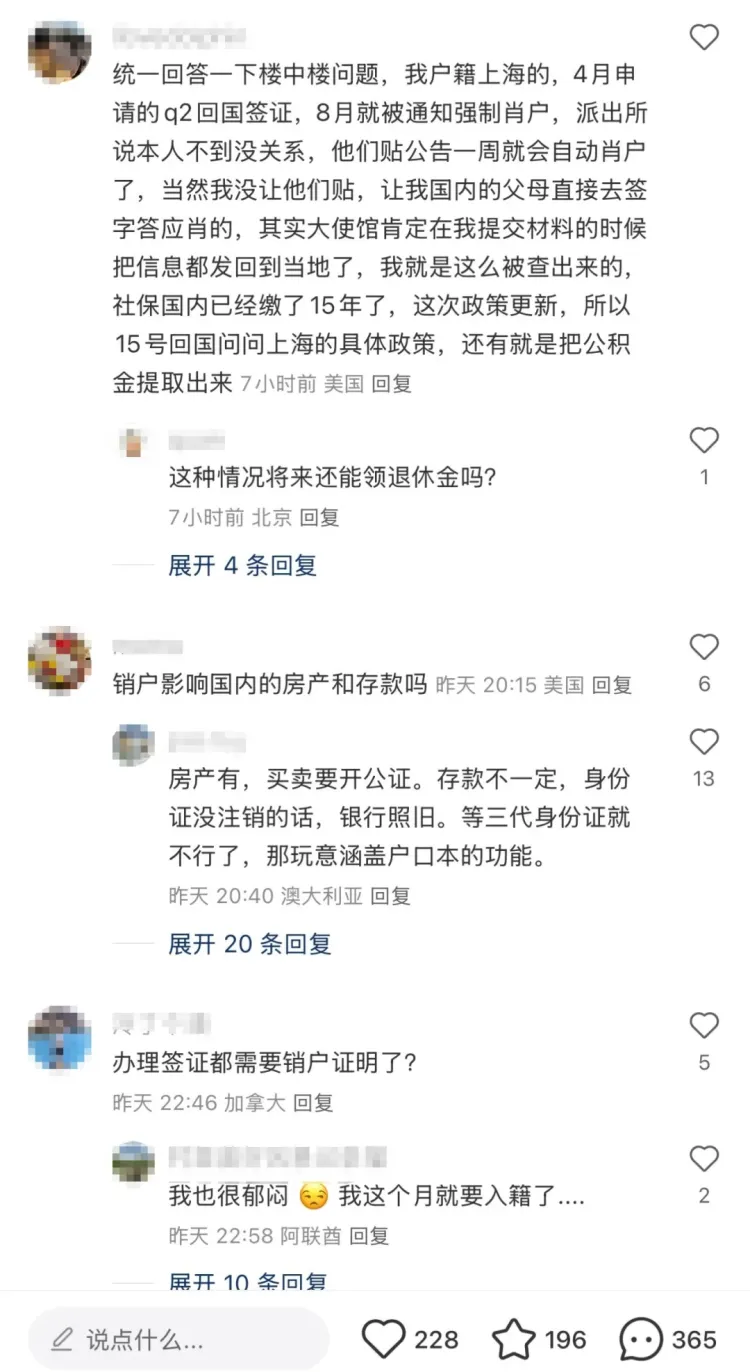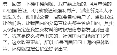 这位IP显示美国的网友说:我户籍上海的,4月申请的Q2回国签证,8月就被通知强制销户,派出所说本人不到没关系,他们贴公告一周就会自动销户了,当然我没让他们贴,让国内的父母直接去签字答应销的,其实大使馆肯定在我提交材料的时候把信息都发回到当地了,我就是这么被查出来的社保国内已经缴了15年了,这次政策更新,所以15号回国问问上海的具体政策,还有就是把公积金提取出来 。