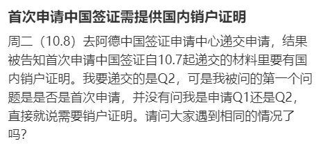 网友称,自己在10月8号去去阿德中国签证申请中心递交申请,结果被告知,首次申请中国签证自10.7起递交的材料里要有国内销户证明。