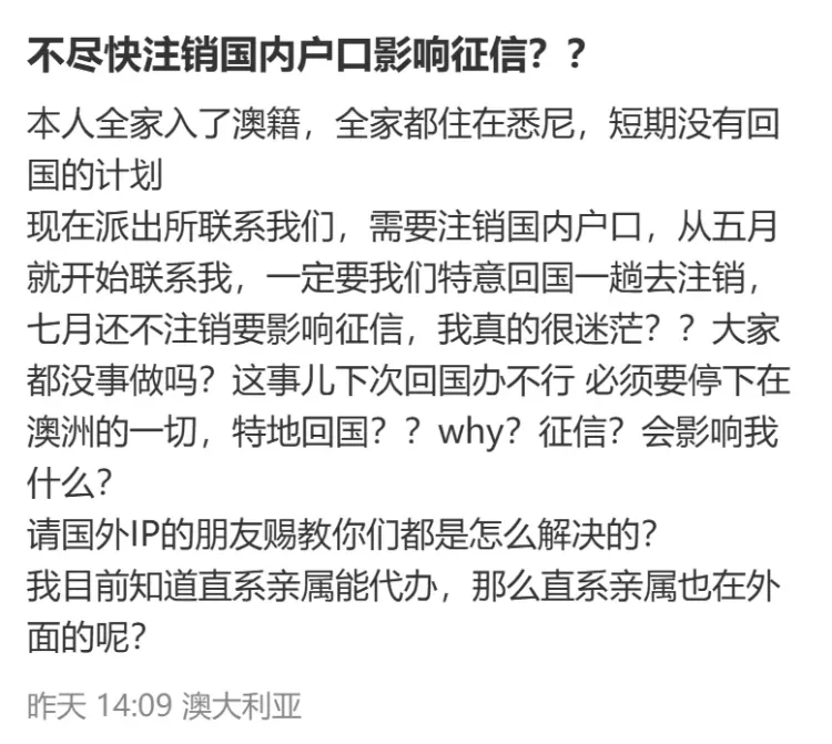 还有一位澳大利亚的网友说:女儿入澳籍后第一次申请中国签证(Q2),5月份提交申请时没有要求销户,9月份户主接到派出所要求销户的电话,并说如果近期不主动办理销户将会被强制销户。