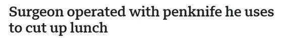 据悉,这名外科医生平日里有随身携带瑞士军刀的习惯,主要是拿来切水果的,但用作无菌手术刀明显不合格。