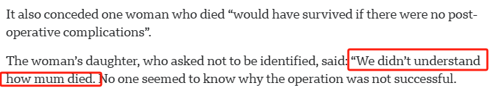 其中一个死亡患者家属表示,“如果我妈妈没有患上术后并发症,本来是可以活下来的,我们都不明白她是怎么死的,没人知道手术为什么不成功。”