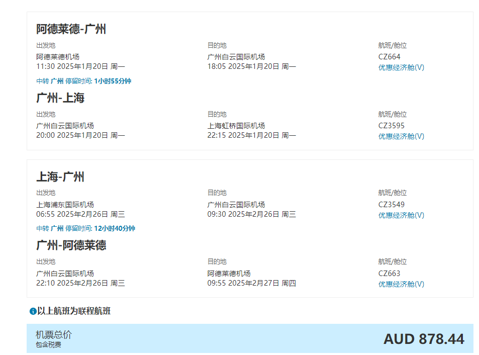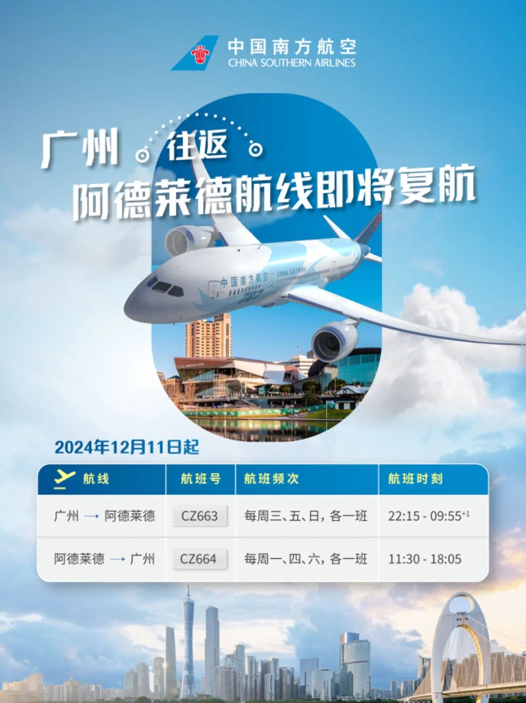 阿德莱德旅客也有直航啦!直飞广州CZ664航班,自2024年12月 12日起,恢复至每周一、四、六,各一班。目前往返低至含税878澳币起。