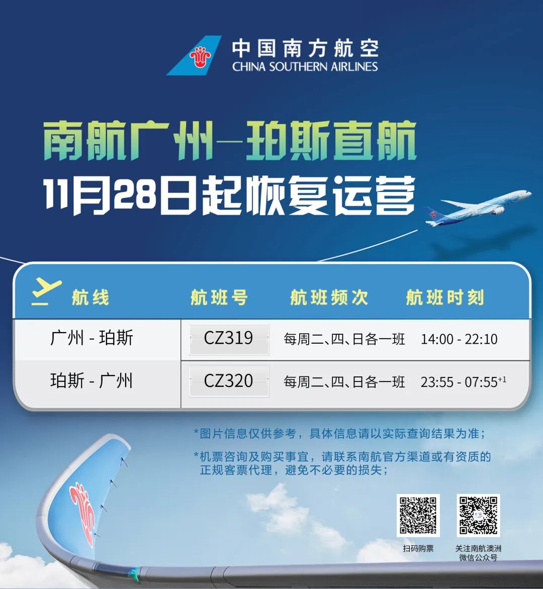 珀斯的旅客看过来,南航珀斯-广州直航将于11月28日开始运营,目前1-2月往返的最低价格为870澳币起,同样也是早鸟优惠价。