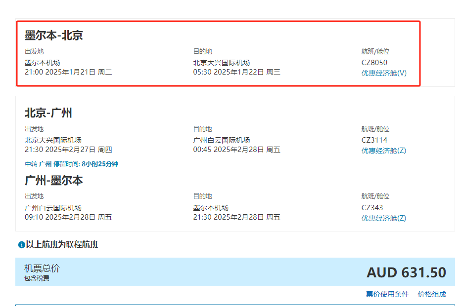 附上墨尔本-北京大兴直飞航线的信息供大家参考: