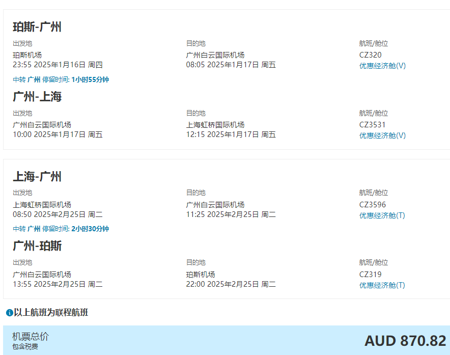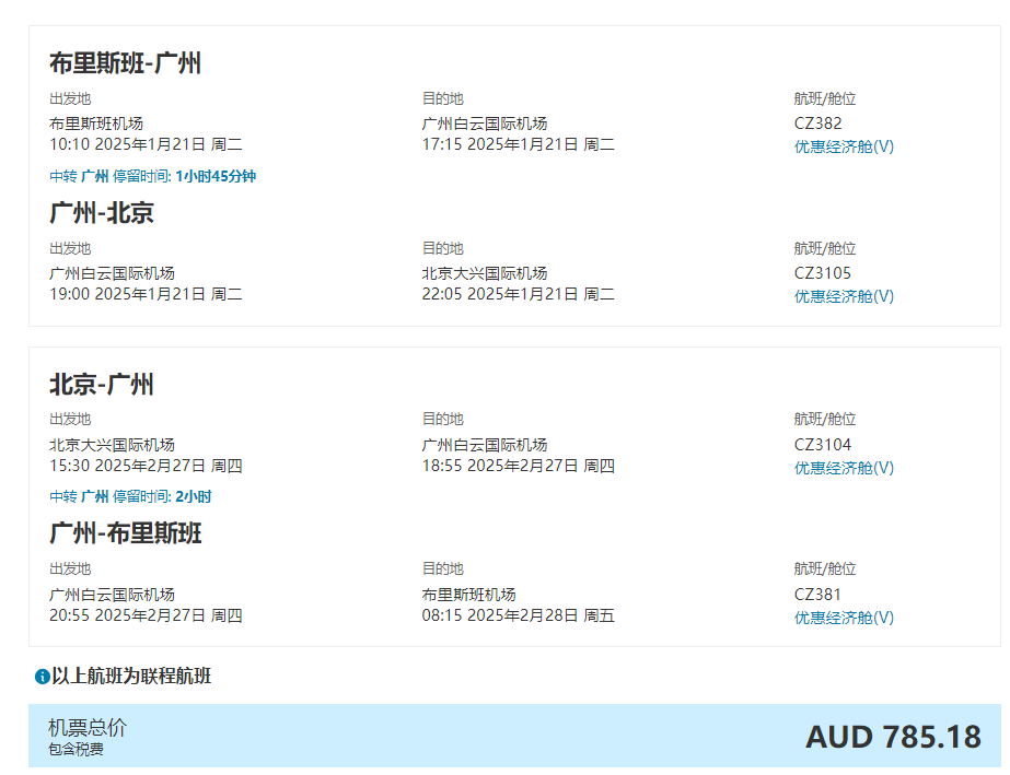 从悉尼出发,您可以选择通过广州转机、深圳转机或者北京大兴转机,享受每天多个航班的灵活搭配。无论是探亲还是旅游,南航的丰富航线将确保您轻松出行。如果1月中旬出发回国,2月上旬回程,往返价格含税1000澳币以内,组合价格给大家放出来参考。