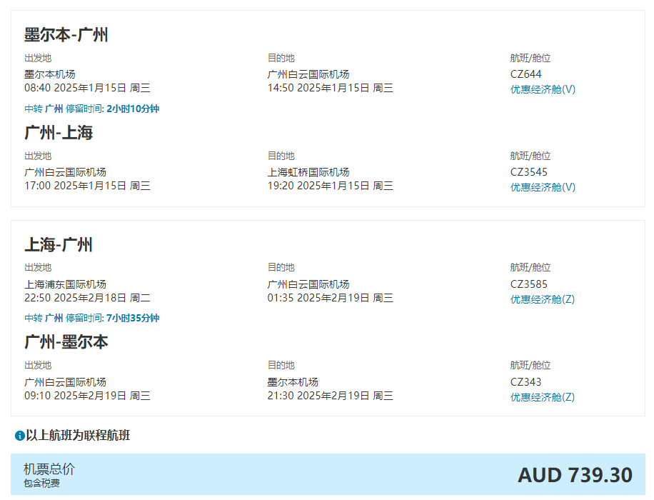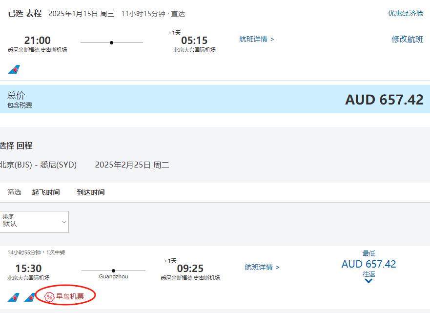如果是想早些返程的旅客,小编也为大家找到特价啦~往返含税仅需739澳币!回国过年啦!