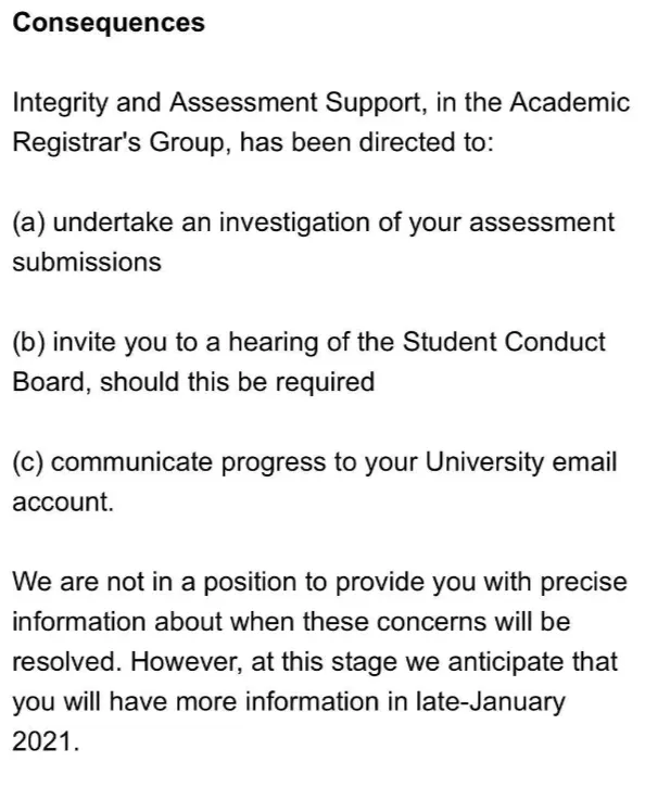 校方表示,目前无法告知学生究竟是哪一份作业有抄袭的嫌疑,如果在接下去的调查中发现作业依旧存在抄袭行为,那么学生将会收到进一步的通知。