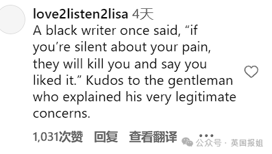 “有位黑人作家说过:‘如果你对自己的痛苦保持沉默,他们会杀了你,还说你是自愿的。’向那个站出来表达合理担忧的兄弟致敬。”