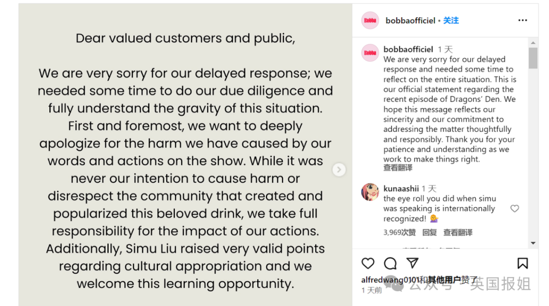 节目中决定给出投资的商人,也立刻撤回了自己的决定,她在Instagram视频中解释道:“经过更多的思考、调查,并听取了大家的意见,我决定不再投资Bobba Tea。”