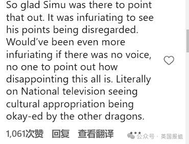 如果没有他发声,看到全国电视上这么公然接受文化挪用会让人更郁闷。”