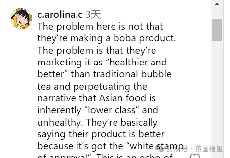 “问题不在于他们做了什么“新式”珍珠奶茶,而在于他们打着“比传统珍奶更健康、更好”的旗号来卖,还加深了“亚洲食物就是低档、不健康”的刻板印象。