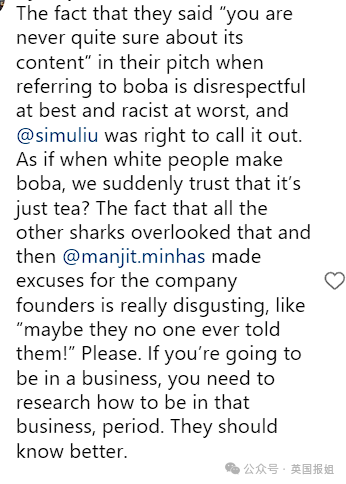 “我希望自己的投资能帮助少数族裔企业家,但我在这里看不到任何对奶茶文化的尊重,也不认为我的资金应该去支持一家从我珍视的文化遗产中获利的企业。