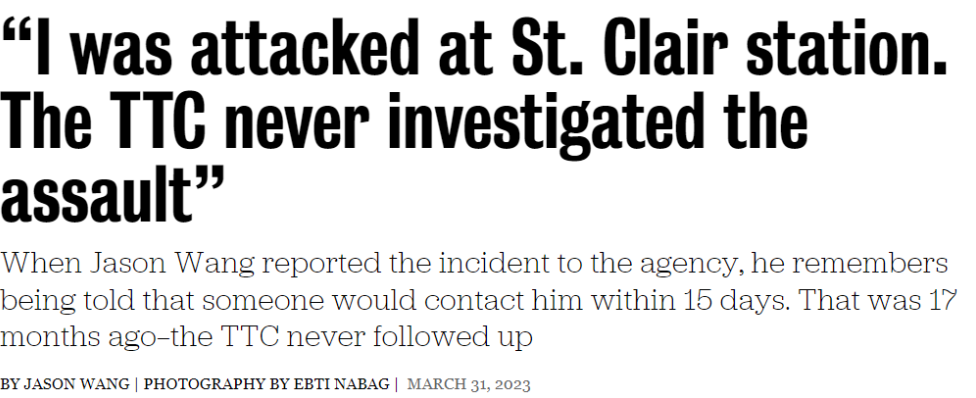 2023年4月,多伦多华人王先生(Jason Wang)亲历在TTC地铁站遭无端袭击。
