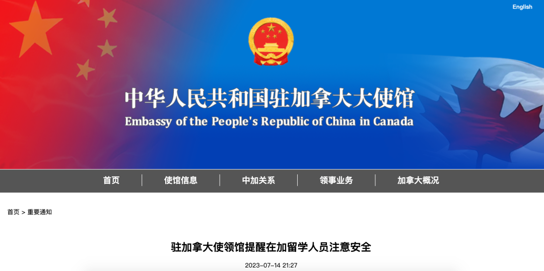 同一年23年7月14日,中国驻加拿大使馆还发出重要通知,提醒在加留学人员注意安全,全文如下: