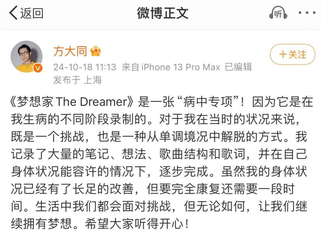 原来,此前方大同发文表示,这是一张 “病中专项”,称专辑是生病的不同阶段录制的。“对于我在当时的状况来说,既是一个挑战,也是一种从单调境况中解脱的方式。虽然现在身体状况已经有了长足的改善,但要完全康复还需要一段时间。”