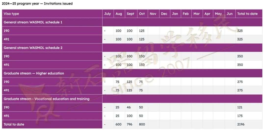西澳本财年拿到的配额非常多,190达到3000个;491达到2000个。一定抓住本财年机会,早规划,早递交,早获邀!