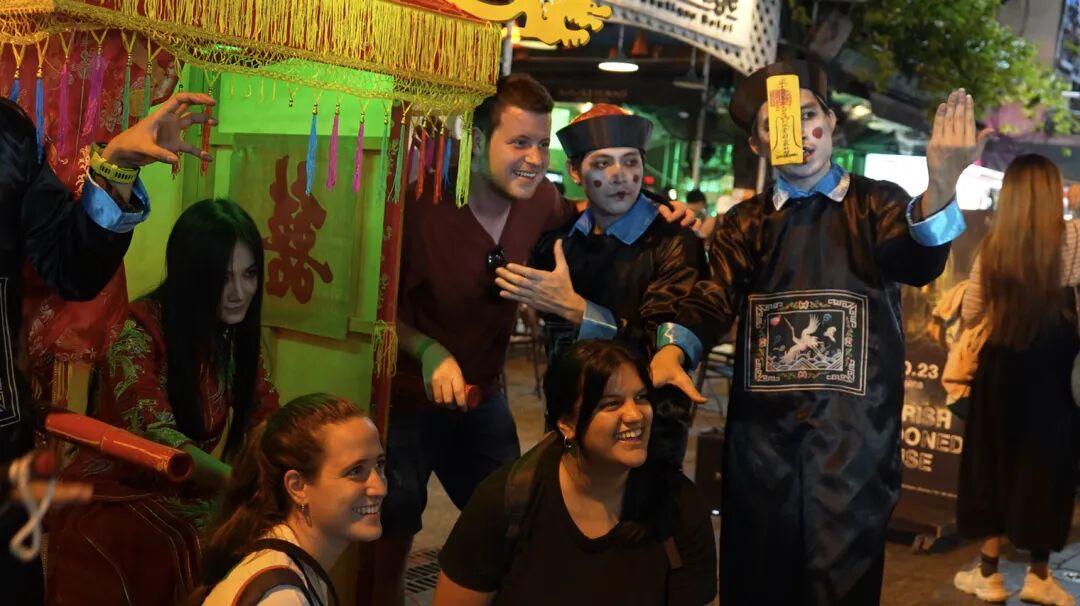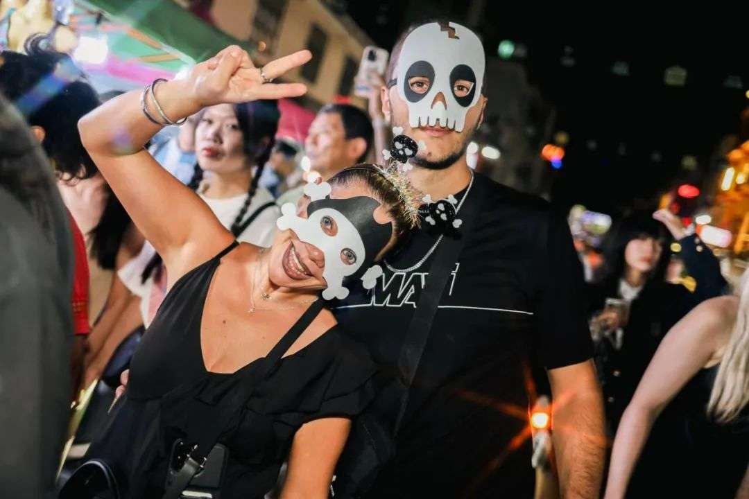 当晚,考山路上聚集了大批前来庆祝的外国游客,多数游客化着逼真的万圣妆,千奇百怪的“鬼怪”在街上横行。