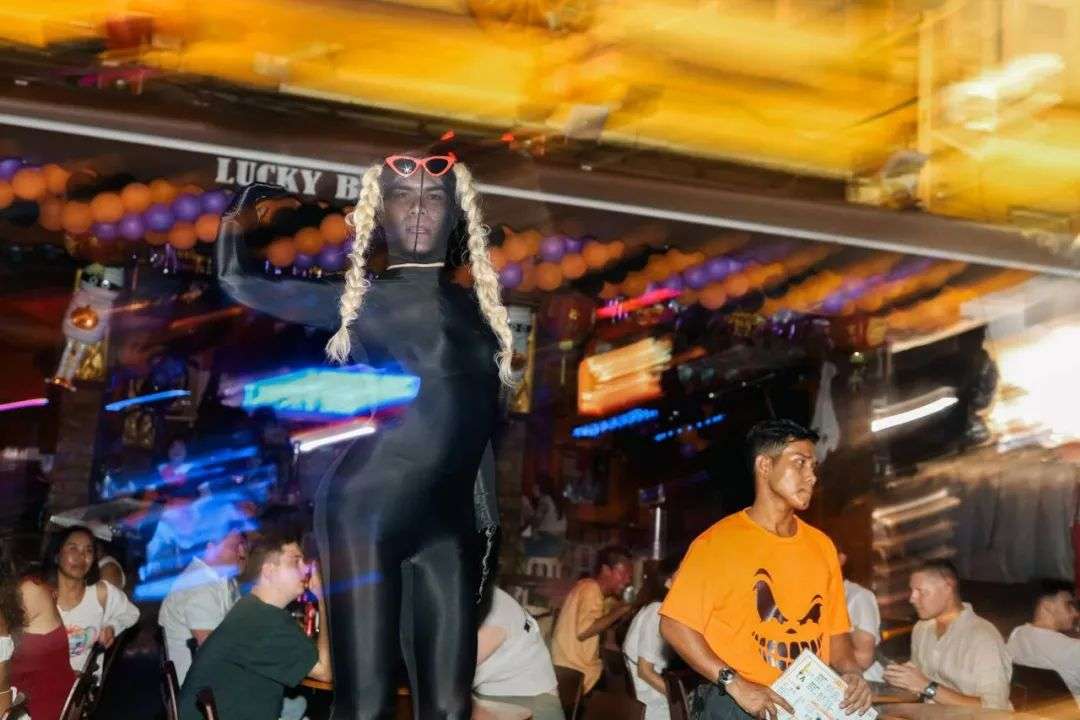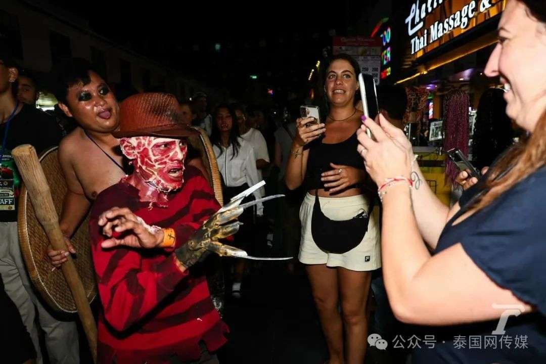 另一方面,作为芭提雅知名旅游景点的步行街在万圣节当晚也异常热闹,不仅有化着鬼怪妆容的行人穿梭的街道上,步行街的夜店服务人员也扮成鬼怪接客。