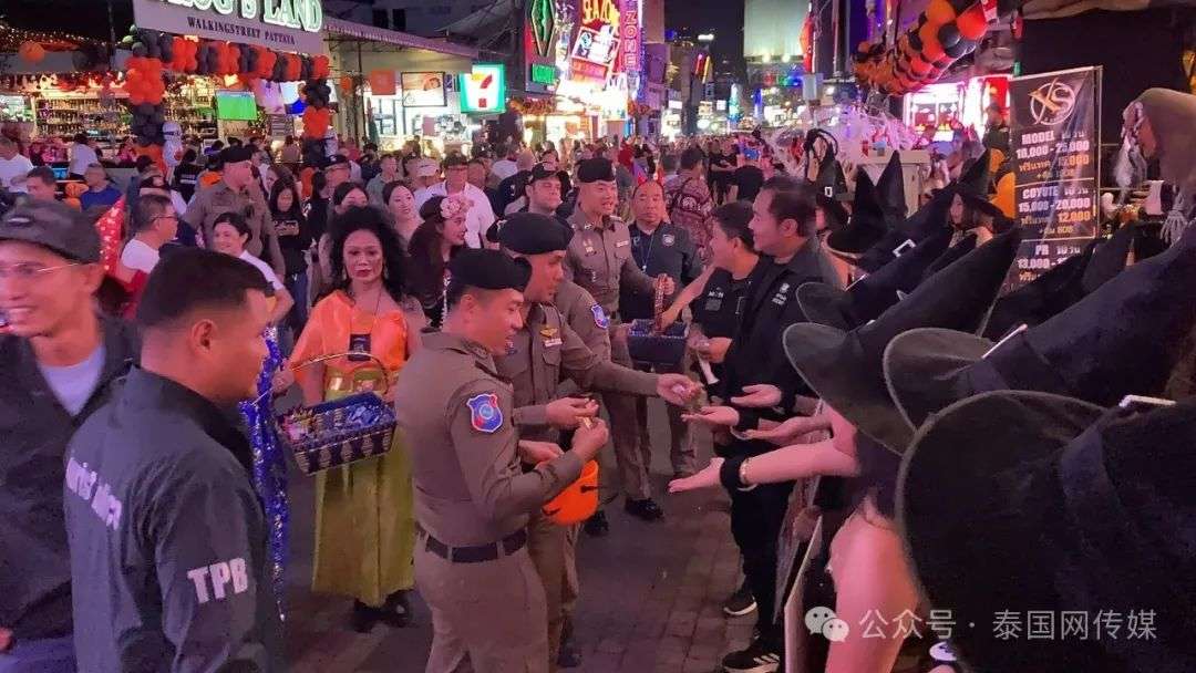 当晚,为保障游客的人身安全,芭提雅旅游警察沿街巡逻并与游客亲切互动。