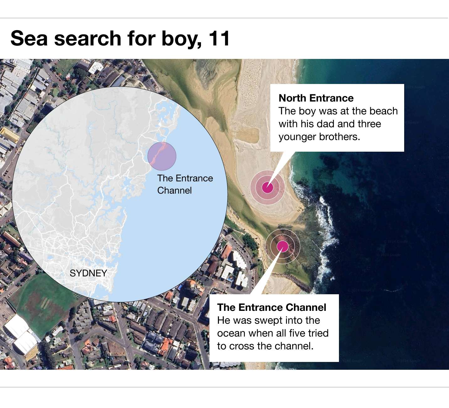 两架直升机和几艘救援船在入口附近海域搜寻,Marine Area Command、Surf Life Saving、Toll and Westpac救援直升机协调海陆空救援工作。