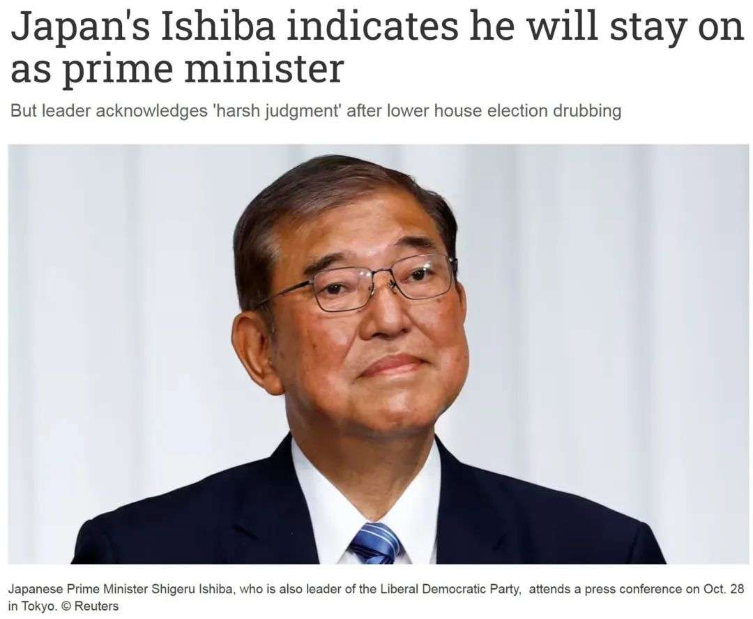 此次选举中,自民党丢失了56个席位。但日本首相、自民党总裁石破茂28日当天表示不会辞职,他同时表示,没有考虑扩大执政联盟的框架范围,将在与各党派商议沟通的基础上考虑内阁的运营方式。