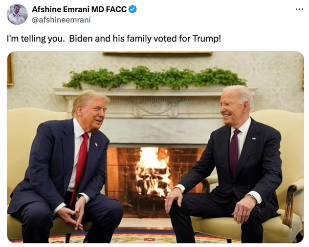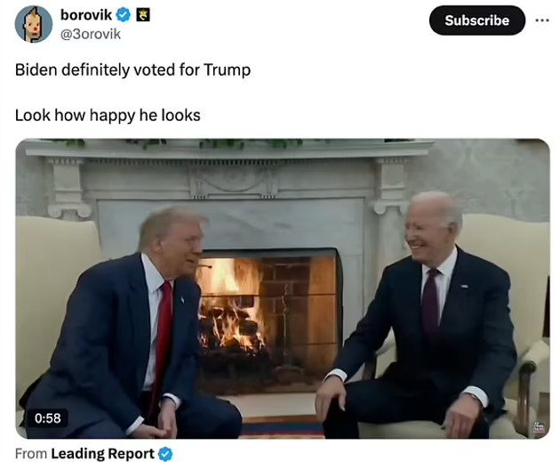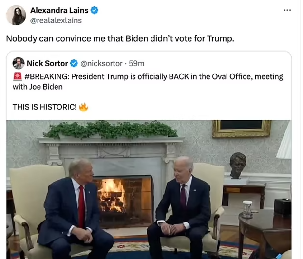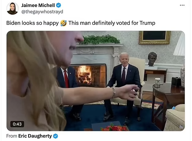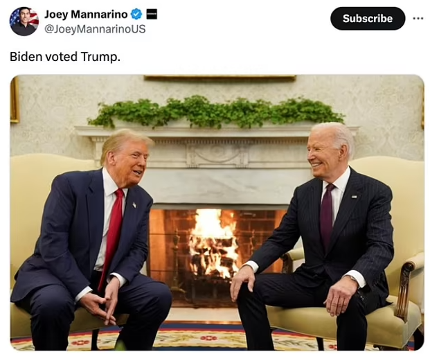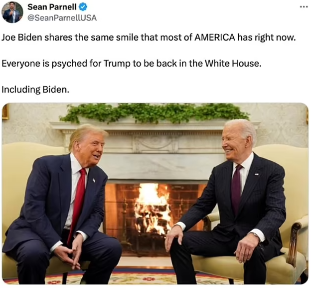 有人说拜登的笑容象征了两党合作的希望,有人却脑洞大开,把它解读成“拜登投票给了川普”的实锤证据。前共和党国会议员候选人肖恩·帕内尔在X(原Twitter)上幽默地写道:“拜登和大多数美国人现在拥有同样的笑容——看着川普回归,喜上眉梢。”