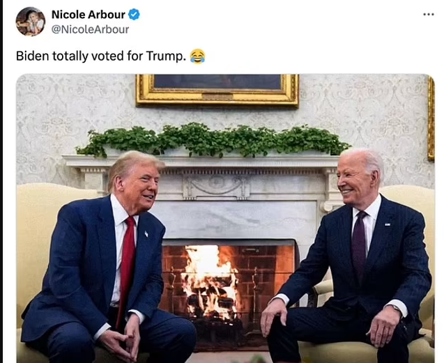 另一位网友妮可·阿尔布尔甚至在推文中表示:“拜登肯定投票给了川普!笑得那么灿烂,谁能不怀疑?”配图是一张拜登大笑的表情包,火速获得数万点赞。
