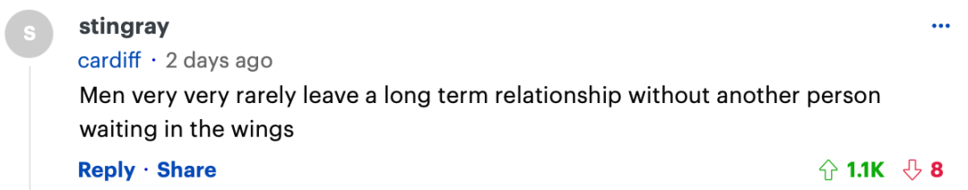 “男人很少会在没有另一个人在等待的情况下结束一段长期关系。”