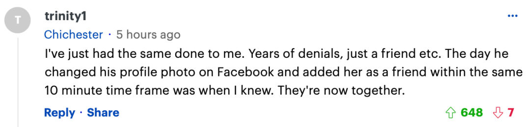 “我也遭遇过同样的事。他多年来一直否认,解释说只是朋友等等。但那天他在 Facebook 上更改了个人资料照片,并在 10 分钟内将她添加为好友,我立马知道了一切。