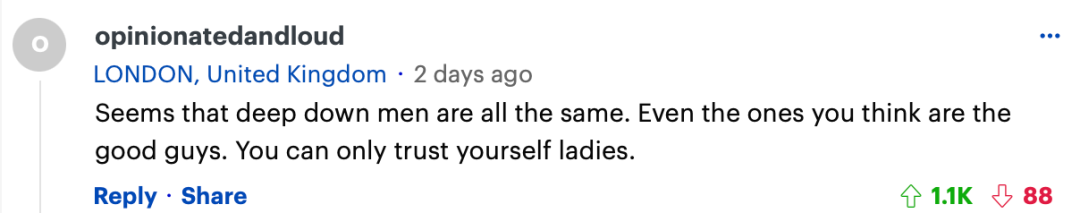 “似乎男人内心深处都是一样的。即使是那些你认为是好人的人。女士们,你们只能相信自己。”