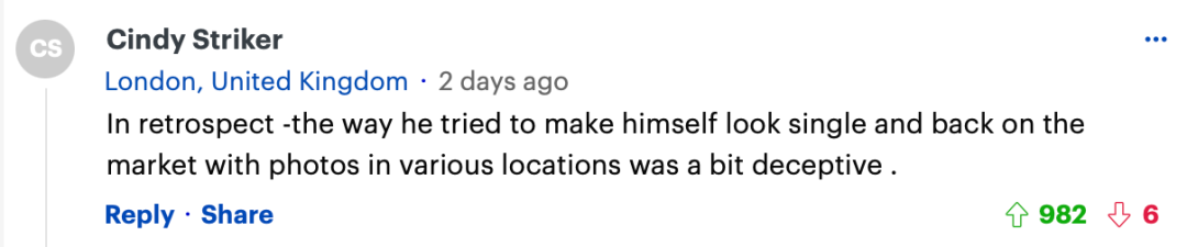 “回想起来,他试图通过在不同地点发布照片来让自己看起来单身并重返择偶市场,这种做法有点欺骗性。”