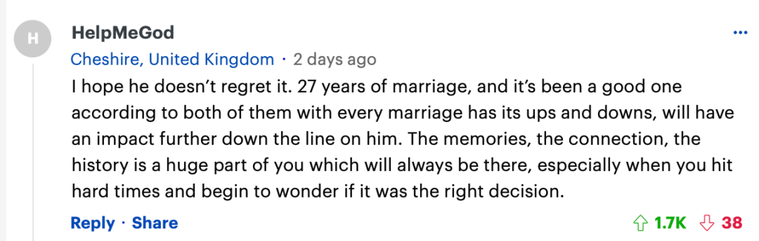 “我希望他不会后悔。27 年的婚姻,两人都认为这段婚姻很美好,每段婚姻都有起伏,这些都会对他以后的生活产生影响。