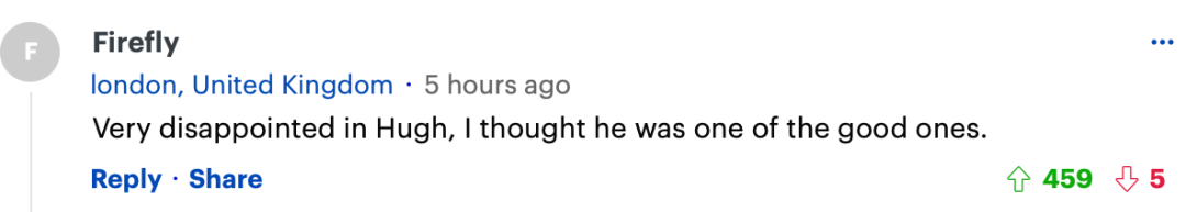“对休非常失望,我以为他是好人之一。”